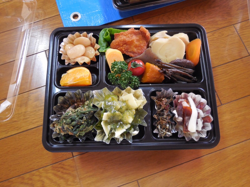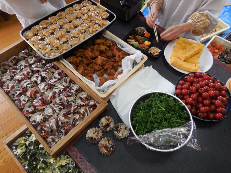 祭典終了後には、神社世話人の皆さんの協力のもと、旬の山菜に彩られた手作り弁当にて直会でした。